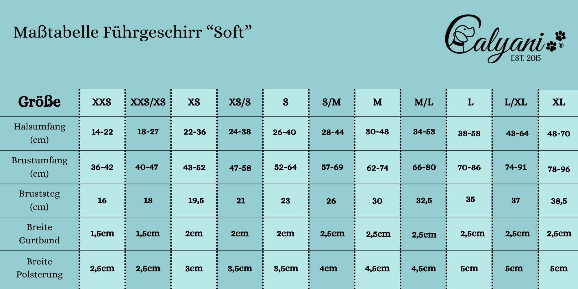 Die Standardgrößen sind gleich mit denen vom Führgeschirr "Soft".