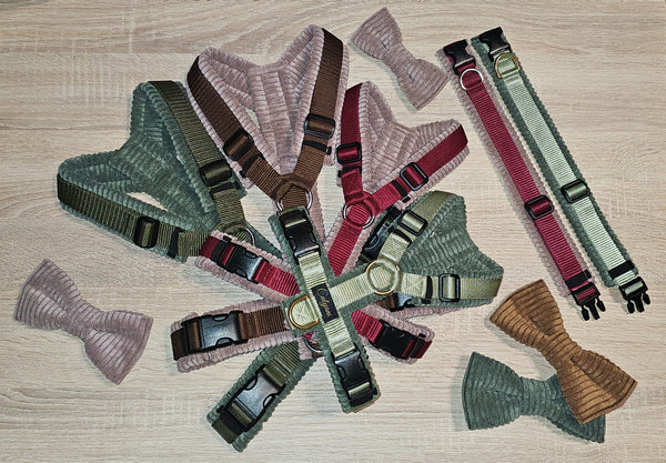 Konfiguriere dir hier dein individuelles Halsband mit weicher Cordpolsterung. Perfekt für die kalte Jahreszeit geeignet. Wähle aus 13 Cordstoffen, über 40 Gurtbandfarben und 3 Metallfarben deine Wunschkombination aus.